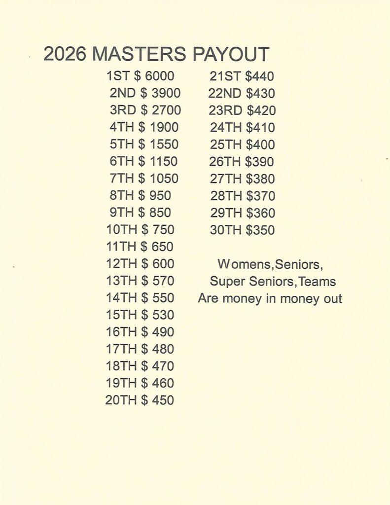 Here is the payout for next years Masters. The 30th Anniversary of the Tournament!